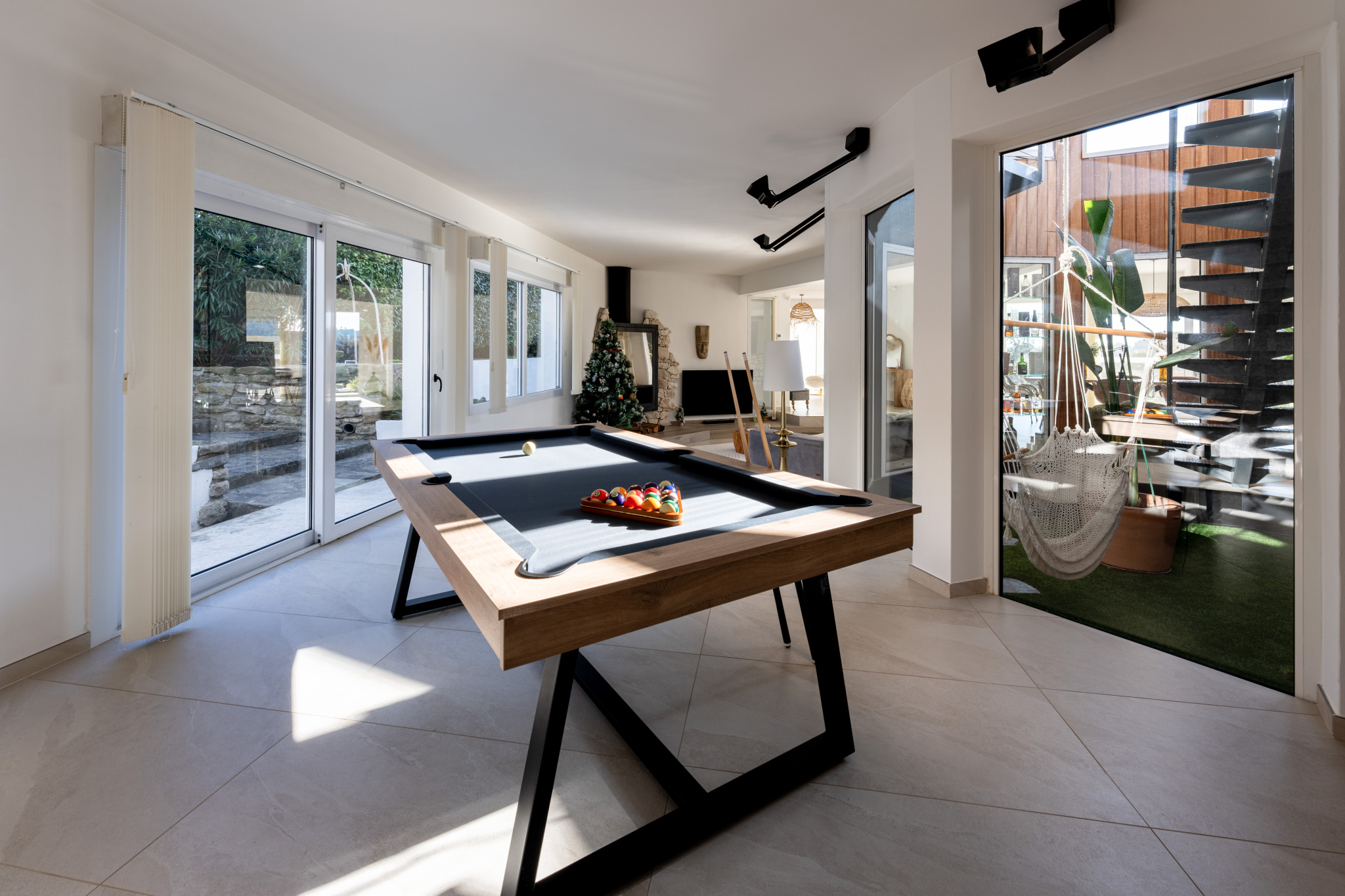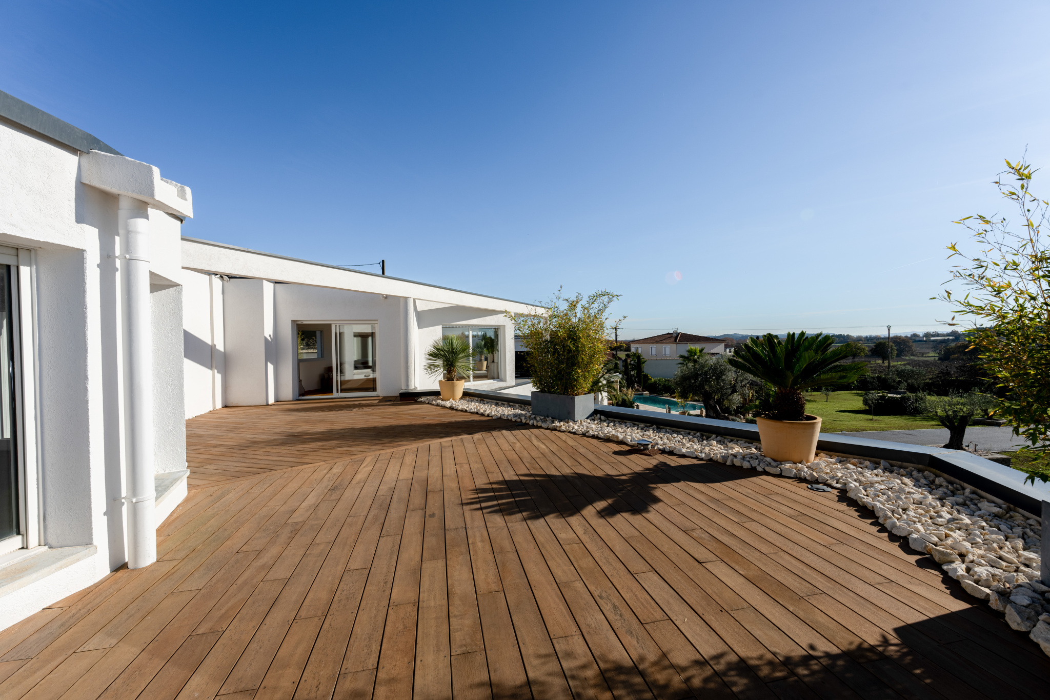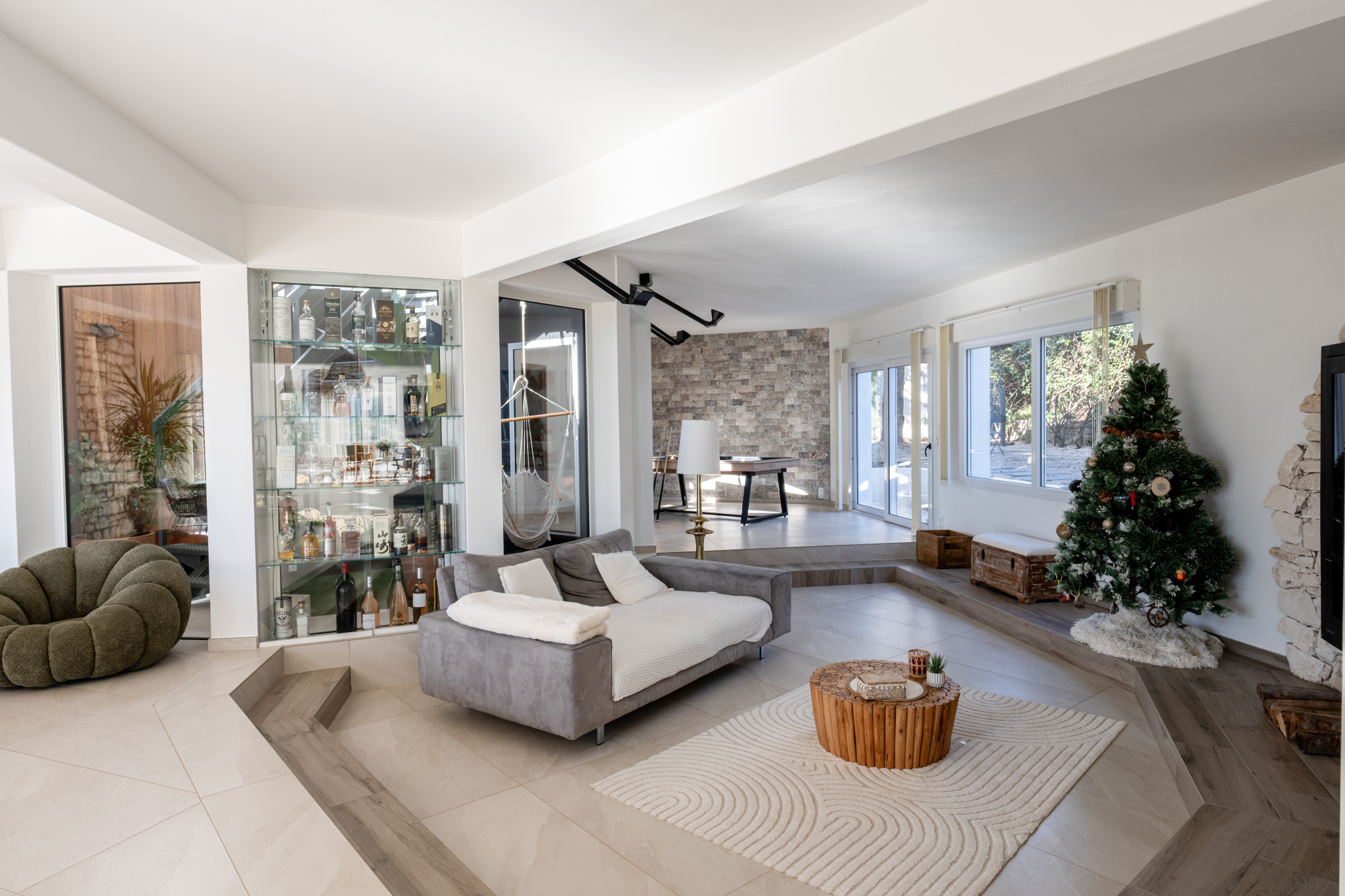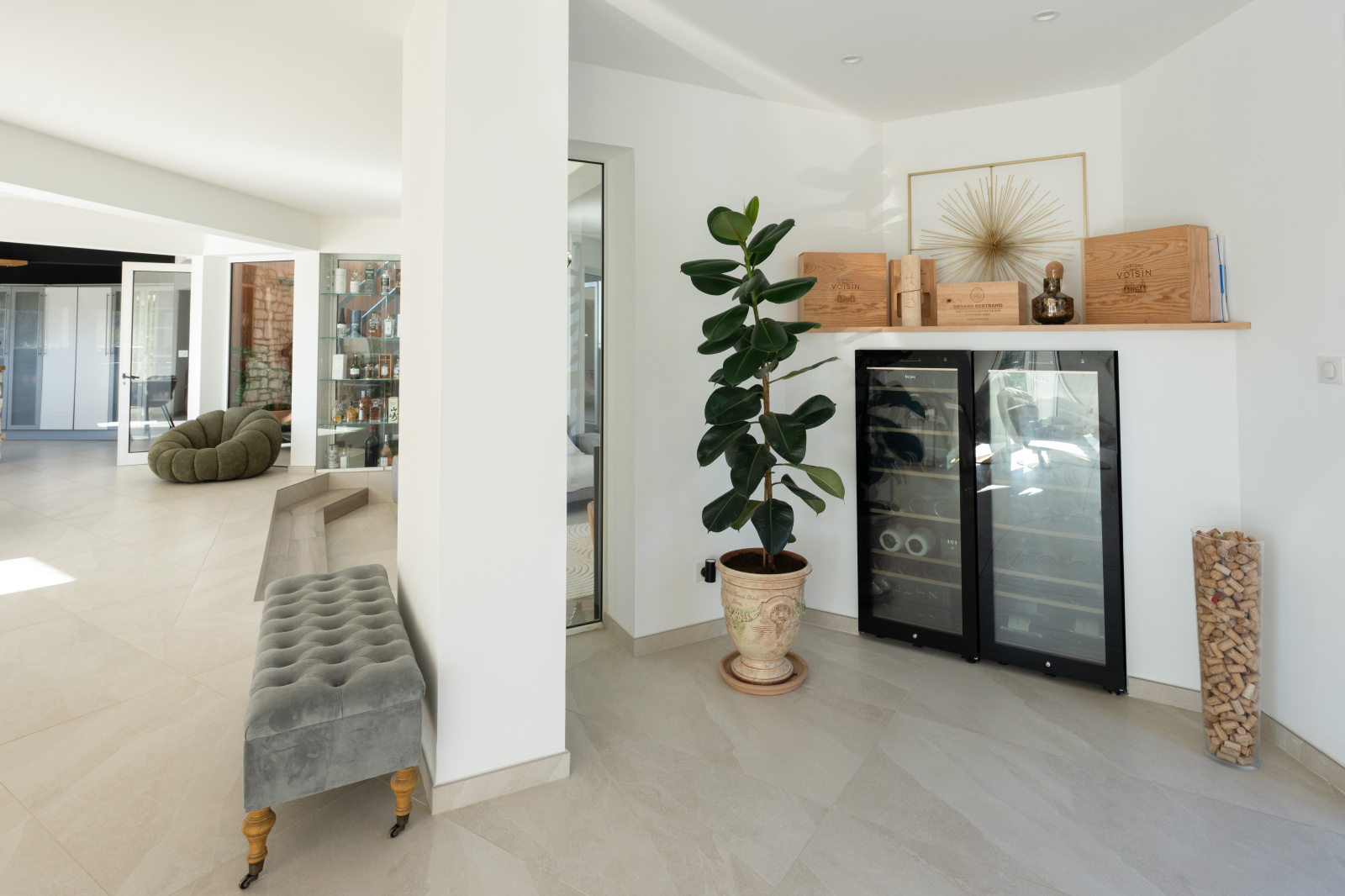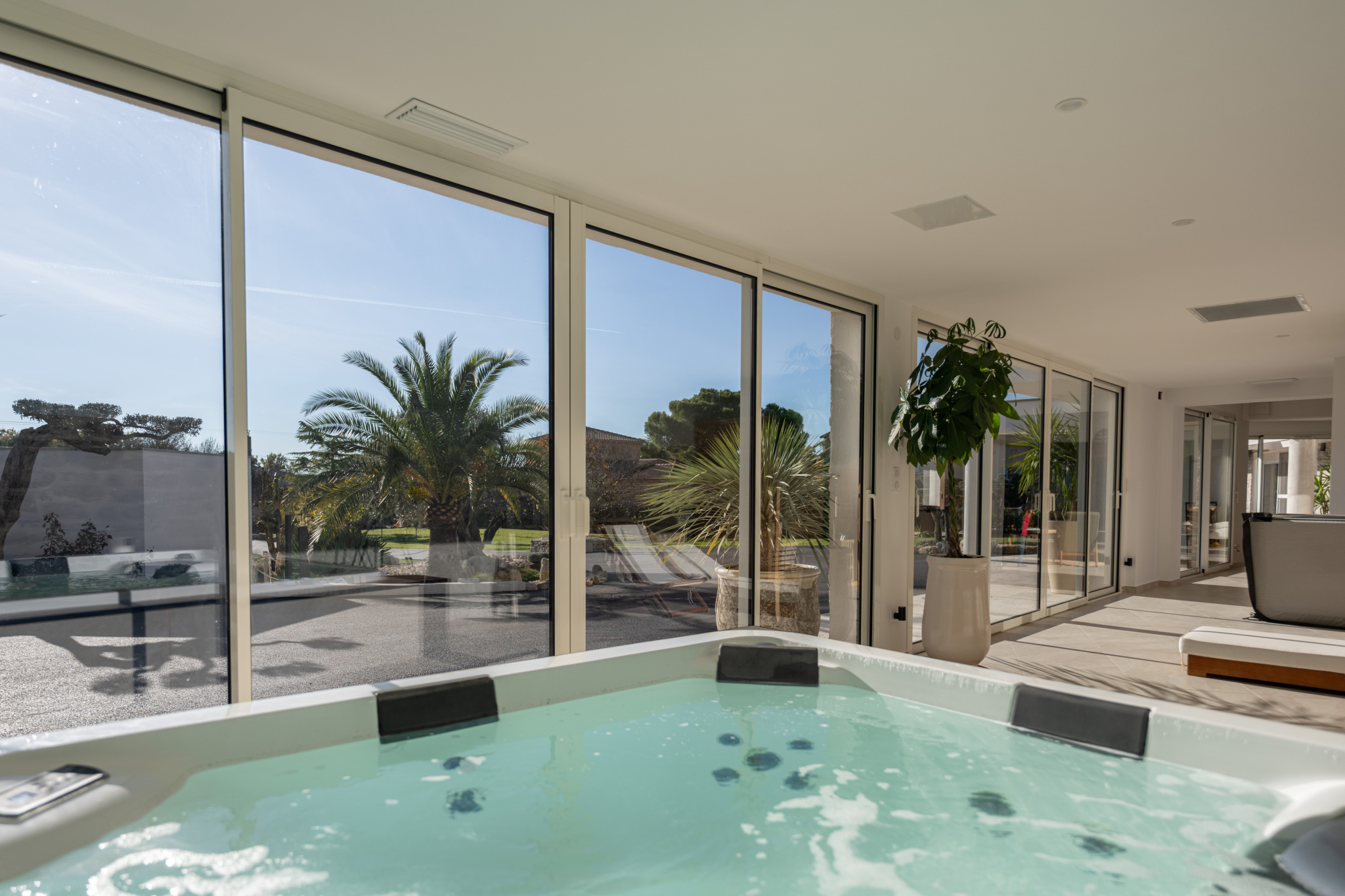 Articulée autour d'un patio intérieur tel un jardin d'hiver, cette contemporaine dispose d' une pièce de vie traversante de 175 m² longeant toutes les terrasses séparées par d'interminables baies vitrées, promettant une sensation de sérénité. Elle aboutit à un espace détente spa au design épuré et reposant. La cuisine aménagée et équipée bénéficie d'une arrière cuisine plus cellier buanderie.